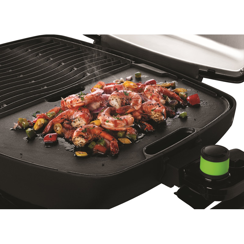 Просторная рабочая поверхность площадью 1839 см² позволяет готовить до семнадцати бургеров одновременно, что делает модель удобной как для семейного отдыха, так и для компании.
