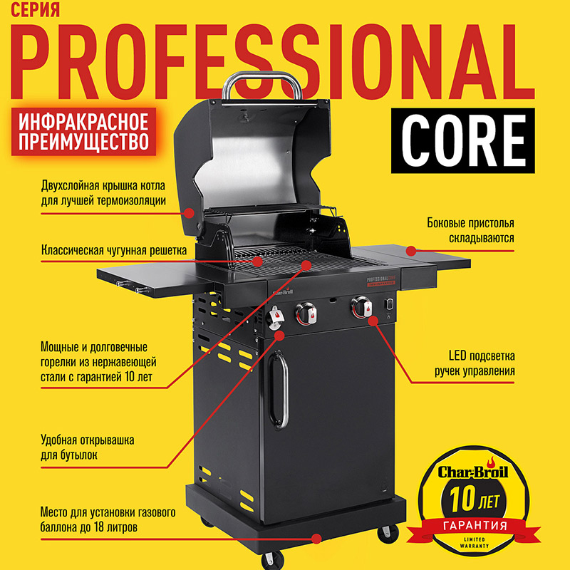 Новейшие газовые грили Char-Broil серии Professional™ третьего поколения, являются нашими самыми популярными моделями в США, Европе и по всему миру. Газовые грили Professional™ оснащаются запатентованной инфракрасной пластиной TRU Infrared™, которая обеспечивает равномерный жар по всей решетке и предохраняет от вспышек капающего жира в котле.