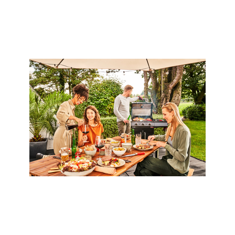 Эффектный черный дизайн, много места для хранения газового баллона и различных аксессуаров. Два из четырех колеса имеют фиксаторы. Для вашего удобства, мы предусмотрели даже встроенную открывашку для бутылок!