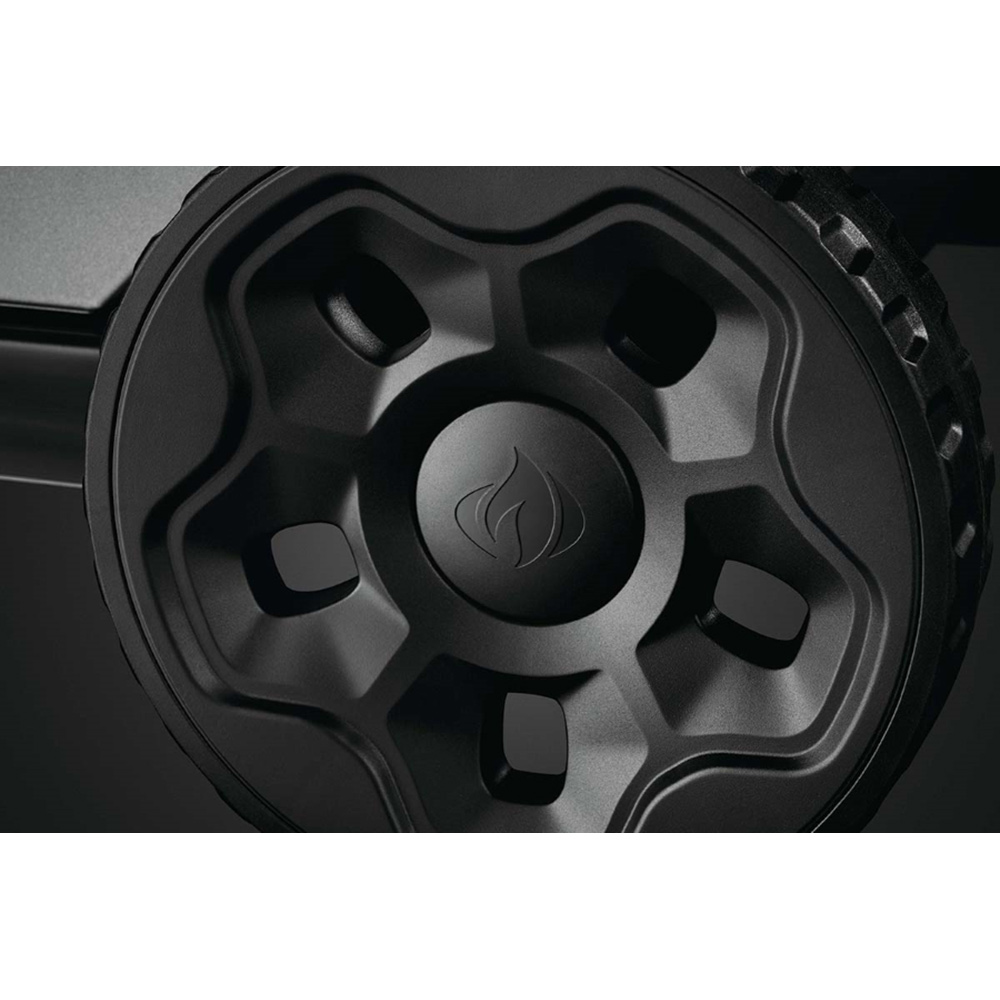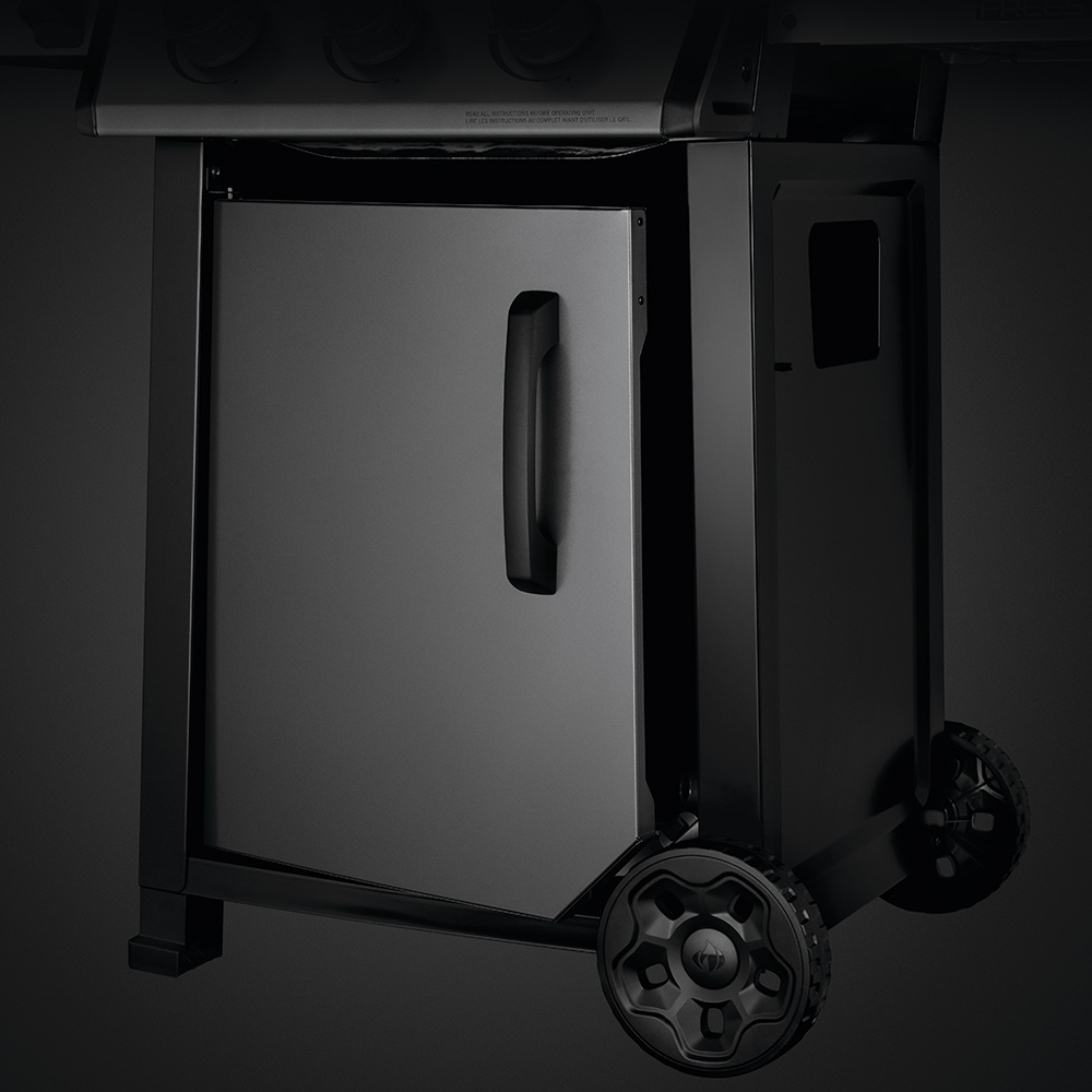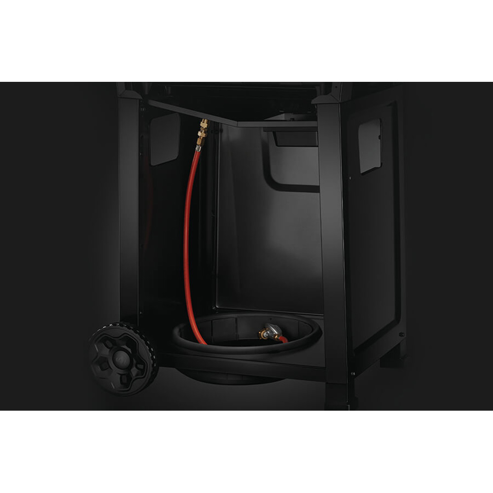 В закрытом панелью основании гриля расположено встроенное посадочное место для газового баллона, в котором он плотно фиксируется и при транспортировке останется на месте.