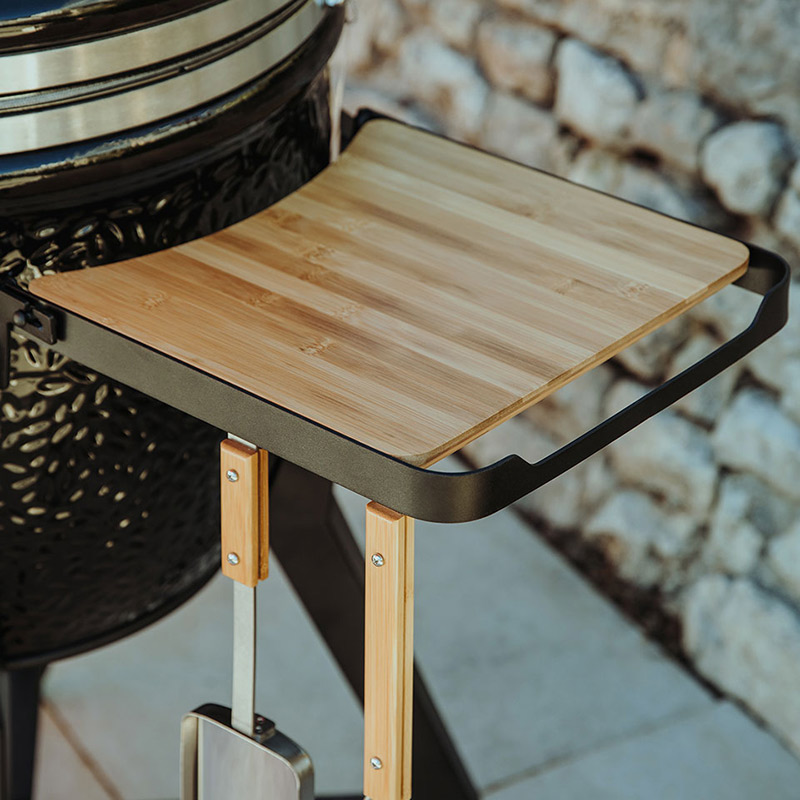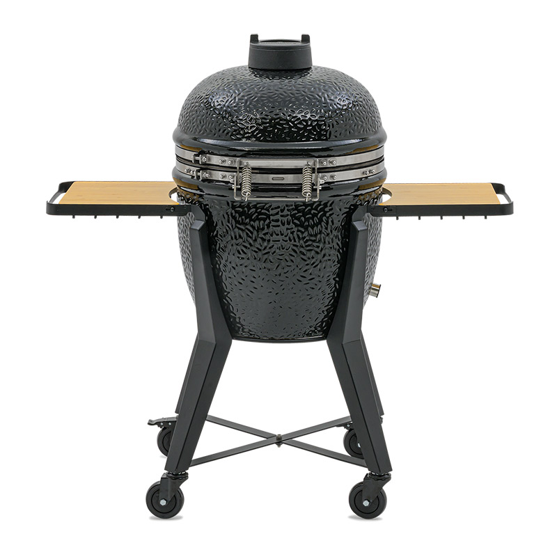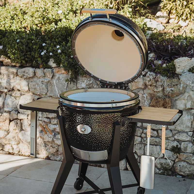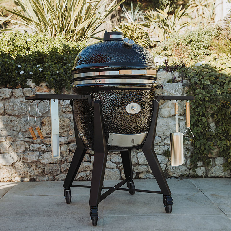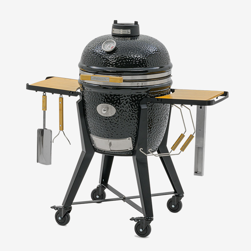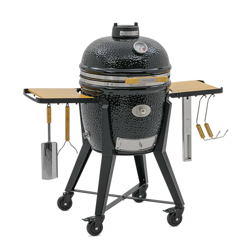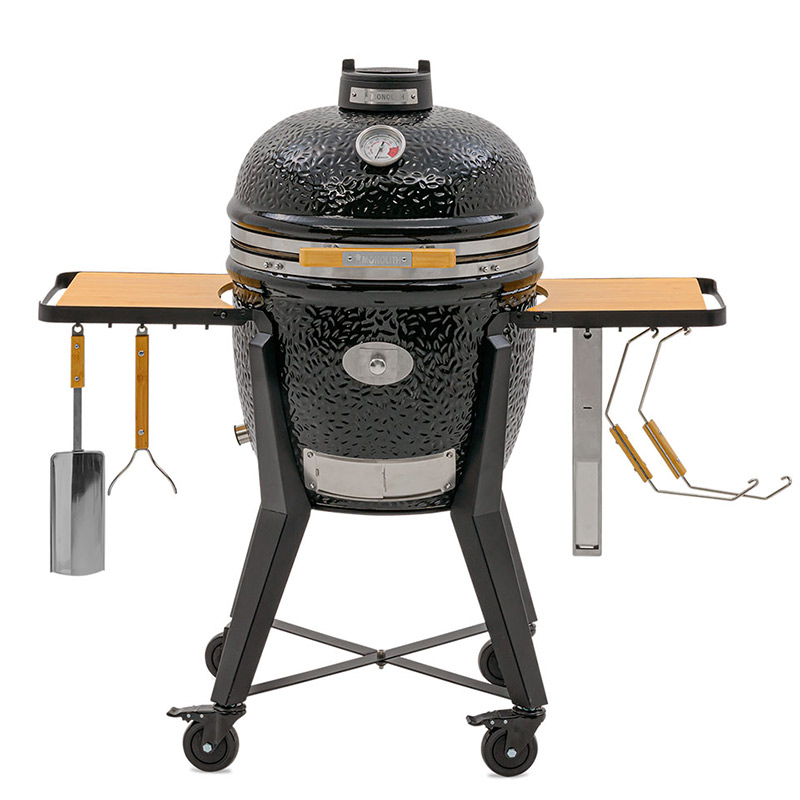 В комплекте поставки Monolith Two.55 есть всё необходимое, чтобы сразу приступить к приготовлению: керамическая футеровка, угольная корзина с разделителем, поддоны для сбора жира, керамические жароотсекатели, две решётки-полуокружности из нержавеющей стали, направляющая для подачи щепы, лопатка для очистки золы и ручка для съёма решёток.
