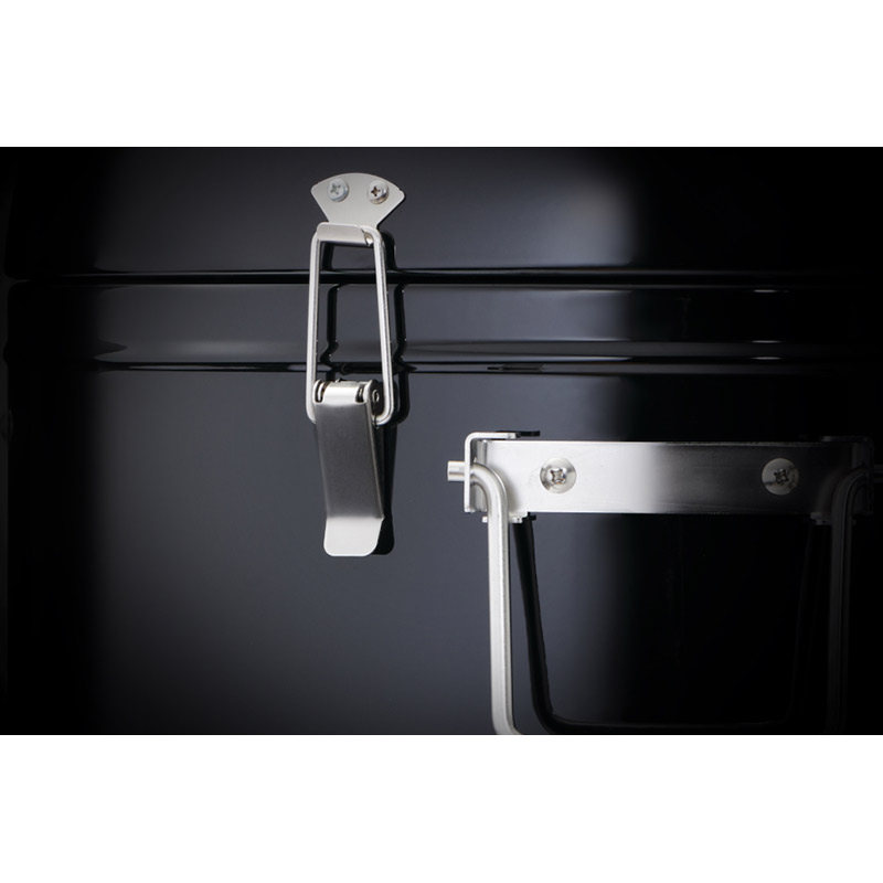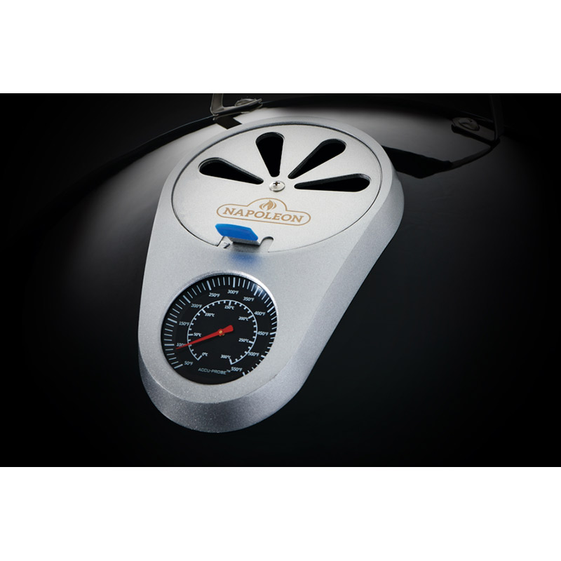 Крышка оснащена встроенным термометром ACCU-PROBE™ (шкала °C и °F) и верхней регулируемой заслонкой для точной настройки тяги. В нижней части расположены три вентиляционные заслонки для контроля подачи воздуха и интенсивности горения.