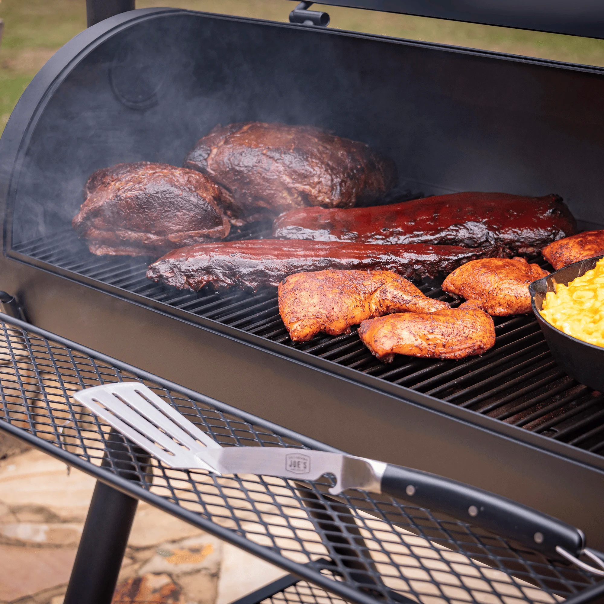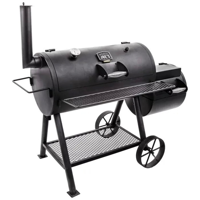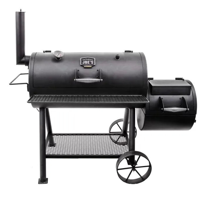 Самая большая коптильня Oklahoma Joe's®. Высокопрочная конструкция жаровни выдерживает экстремальные температуры, даже при копчении дровами. Жаровня снабжена грильной решеткой, имеет удобную заслонку поддува и ненагревающиеся ручки. Просторная камера копчения с крупным, легкочитаемым термометром на крышке. При желании можно самостоятельно вкрутить второй термометр (не входит в комплектацию) для идеально точного контроля температуры в камере. Для удобства работы имеется фронтальная полка и широкая нижняя полка.